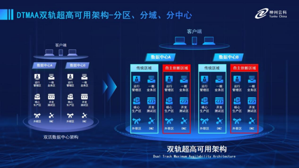 为帮助金融客户更好地应对数字经济时代对可持续性的高要求,实现“信创”与“数字化”齐头并进,富联娱乐官网推出了双轨超高可用架构。该架构在双活数据中心的分区调度基础上,增加信创域和非信创域的分域调度,实行信创域与传统域应用全量部署,使双中心运营变为双中心四区域并行运行,互为多活,将“0到1”的单轨建设道路变为分区分域协同的多活双轨超高可用架构。帮助客户在新架构下,保障“信创”的同时解决性能瓶颈,提升稳定性,保证应用可持续性,最终实现信创区域和非信创区域的平滑过渡,完成国产化替代目标。