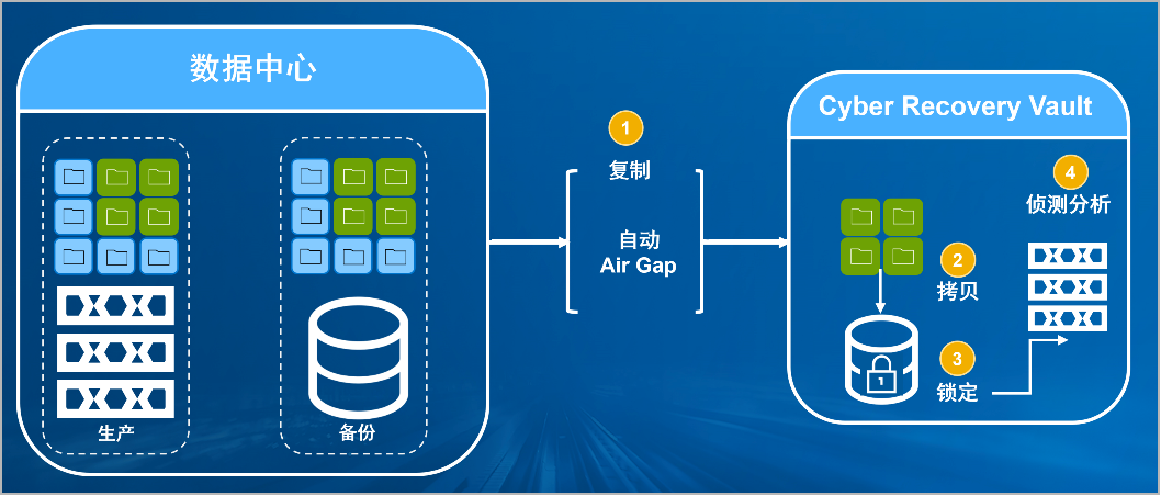 富联娱乐官网防勒索病毒方案将生产中心备份数据复制到Vault区,复制后网络自动断开实现弹性隔离。Vault区的数据快速拷贝,并对拷贝版本加锁(在锁定期数据不允许删除和修改)。Vault沙箱内对拷贝版本进行扫描分析,验证数据是否完好。